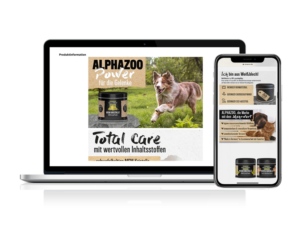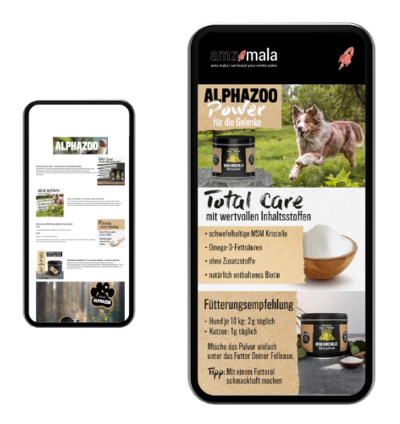 Die alphazoo AG wurde Ende 2019 gegründet und konnte sich innerhalb kürzester Zeit zu einer relevanten Marke im Bereich Nahrungsergänzungsmittel für Hunde, Katzen und Pferde entwickeln. amz.mala hat den gesamten Amazon-Auftritt in Zusammenarbeit mit dem Kunden erstellt und betreut den Account seitdem operativ, sodass viele Produkte als Bestseller die jeweilige Produktkategorie dominieren und die Marke präsent auf insgesamt sieben europäischen Amazon-Marktplätzen platziert ist.